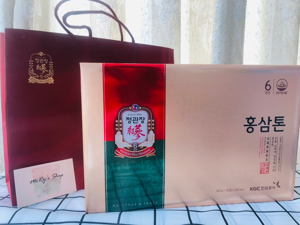 – Thành phần : Tinh chất hồng sâm cô đặc 6 năm tuổi 3% (thành phần chất rắn 60%, Ginsenoside Rg1+Rb1+Rg3 5.5 mg/g) (tỷ lệ pha trộn: củ sâm 75%, rễ sâm 25%), nước tinh khiết, hỗn hợp chiết xuất thực vật ( thược dược,đương quy, quế chi, bạch truật, cam thảo, địa hoàng, thiên cung).
